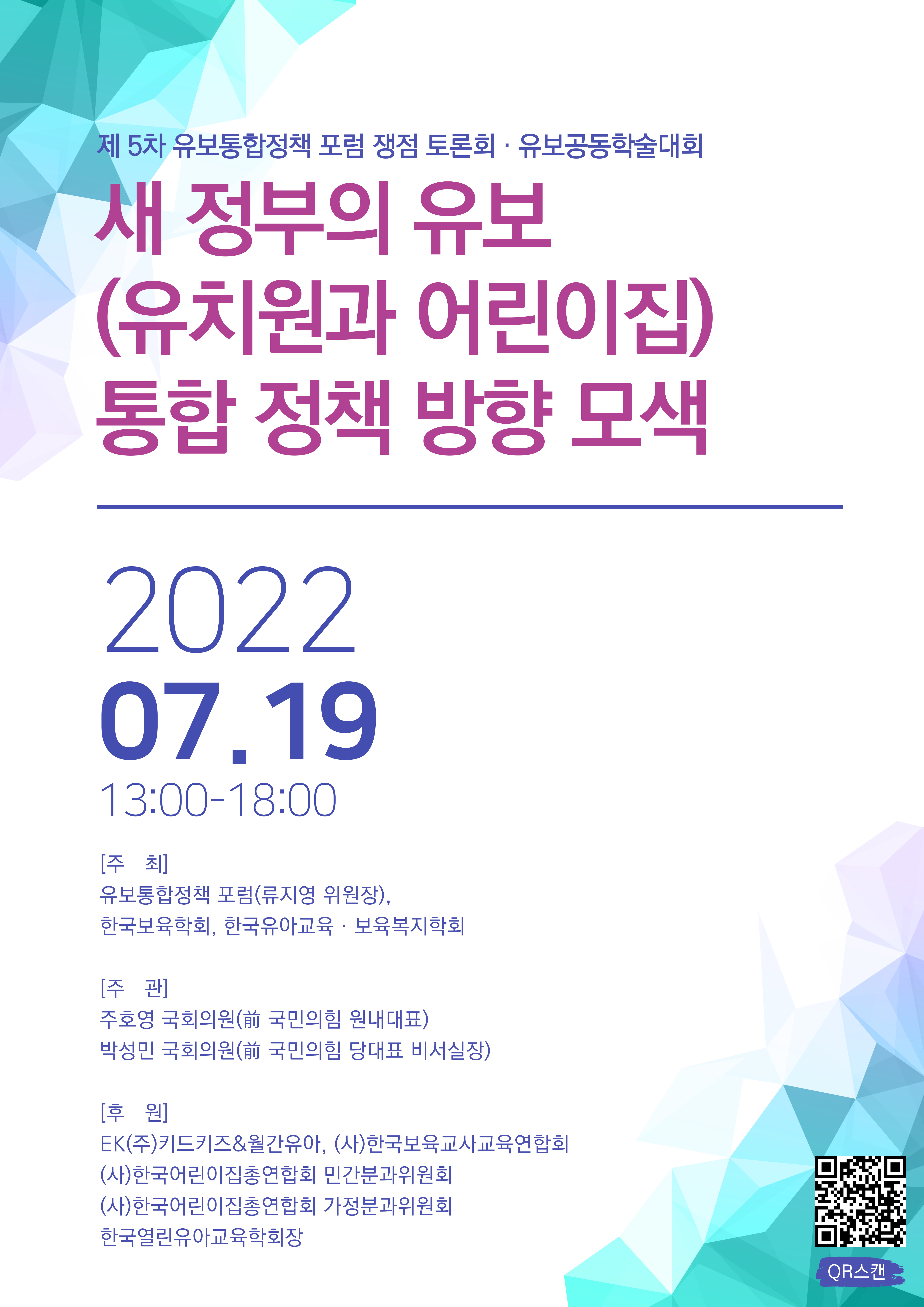 2022년 춘계 한국보육학회 학술대회는 '새정부의 유보(유치원과 어린이집) 통합정책 방향모색' 이라는 주제를 가지고 개최합니다. 유보통합은 새정부의 국정과제에 포함되어 있는 중요 안건으로, 국회에서 개최하고자 하오며 향후 새정부의 유보통합 정책 방향을 제시하는 중요한 학술 토론회가 될 것으로 기대합니다. 많이 참석하시어 고견을 나누어 주시기 바랍니다.